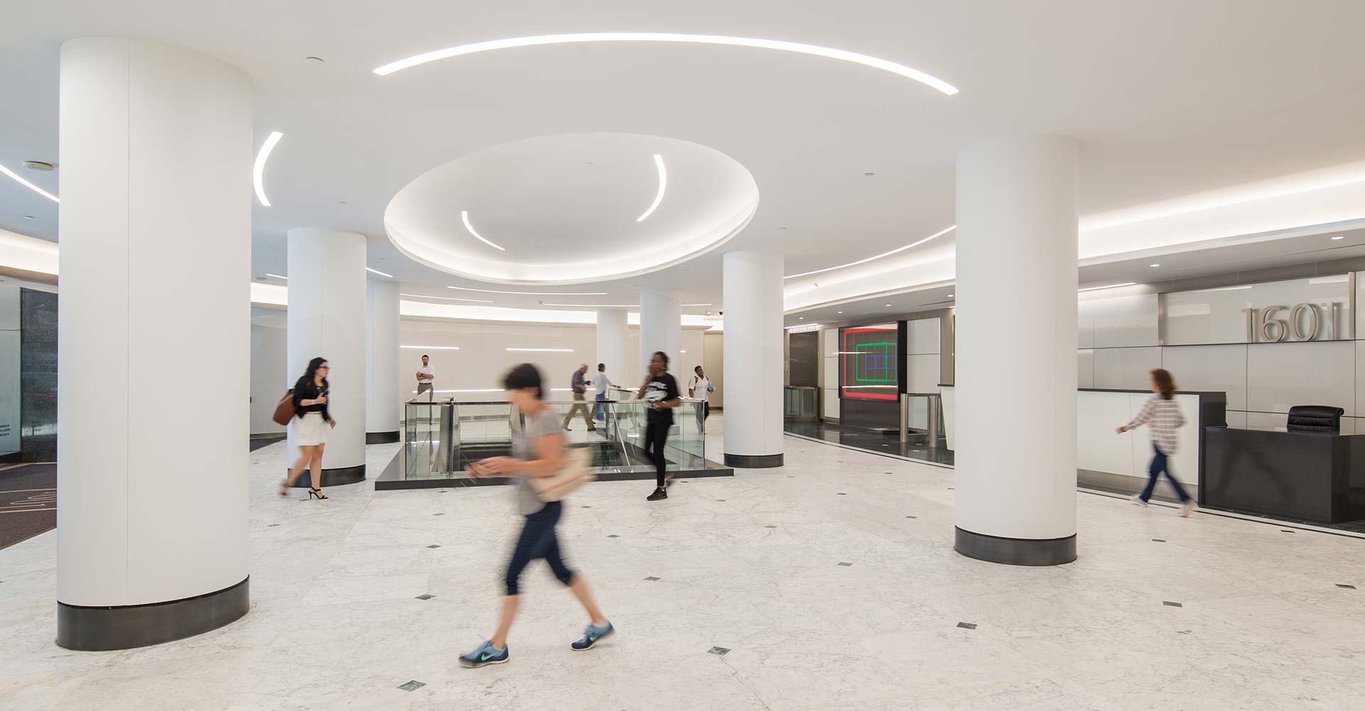Redefining itself, 1601 Market Street heightened its appeal with the addition of an attractive glass façade, enhancing our retail offerings and expanding the second floor office loft space with dramatic 19-foot ceilings. Alongside the façade enhancements, the lobby was sleekly redesigned into a contemporary space resplendent with honed marble floors, radiant white panels and porcelain stone walls. Cutting-edge lighting was added showcasing the original lobby’s architecture, along with a bold, modernist art installation.